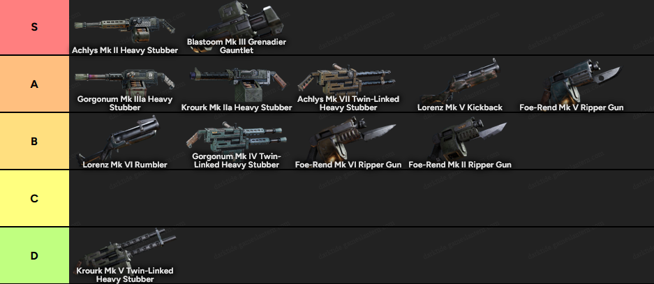 - Achlys Mk VII Twin-Linked Heavy Stubber Best value Stubber in family. Accurate at long distances with short bursts, best synergy with talent tree, best handling compared to competition.